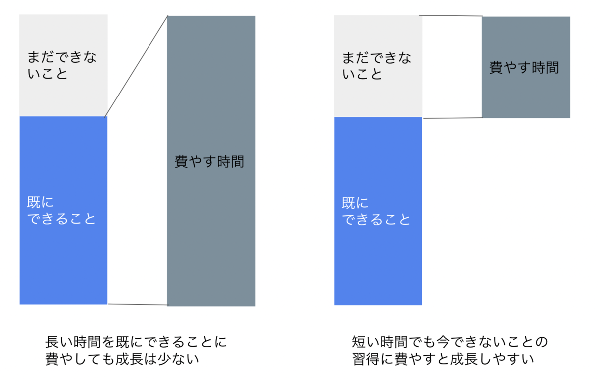 一方で、プロダクトの立ち上げを行なった件は、事業開発やプロダクト作りの仮説検証という当時「まだできなかったこと」の習得に時間を費やしました。労働時間は短かったものの、成長実感は強くあります。これは「できなかったことができるようになったから」ではないかと考えています。既にできることをひたすらこなしても成長は得られにくく、まだできないことの習得に時間をかける方が成長はするのだと思います。