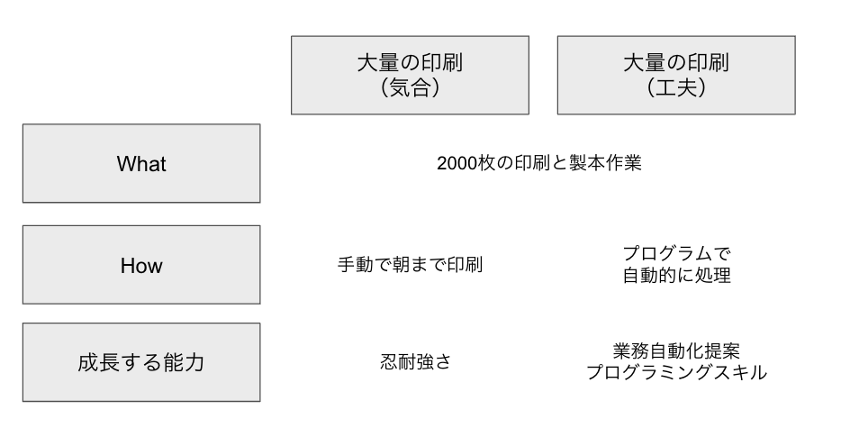 この経験で、業務の自動化提案とプログラミングスキルを少しだけ向上させました。おそらく、自動化せずに手動で全て印刷していれば、得られた成長は忍耐強さくらいだったでしょう。同じゴール(What)でもやり方(How)を変えることで「やったことないこと」に挑戦して成長機会にすることはできるのでしょう。